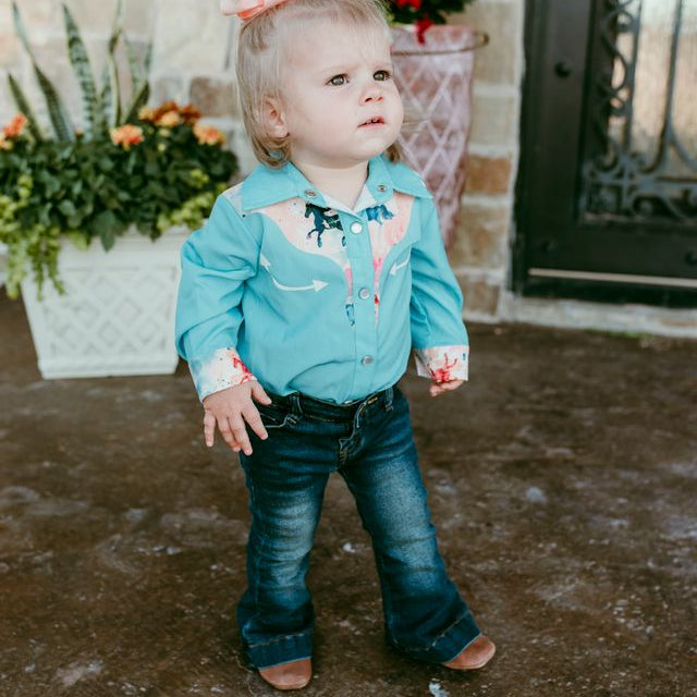 These Best-Selling Girl's Trouser Jeans are the perfect mix of Cowgirl & Style. These jeans come with an adjustable elastic waist band that provides the perfect fit while Flared leg allows for a comfy easy fit over your kiddos boots. Not only are these jeans perfect for riding or on the ranch they are also perfect for going out to the County Fair.