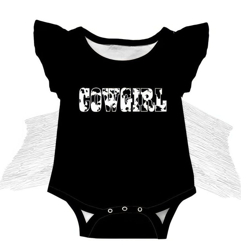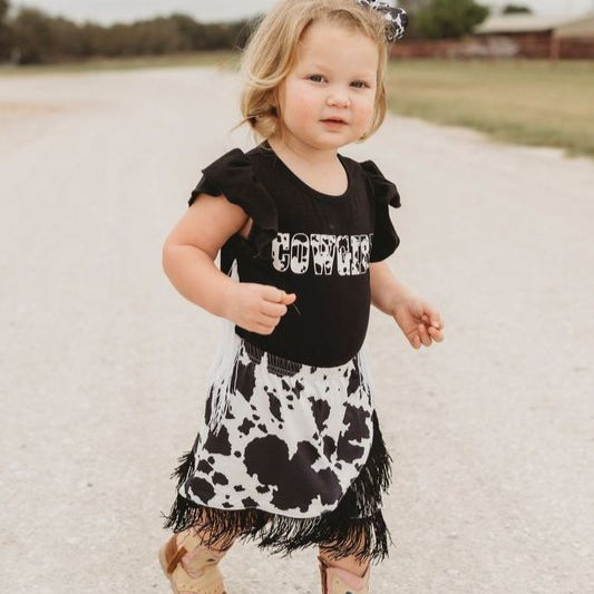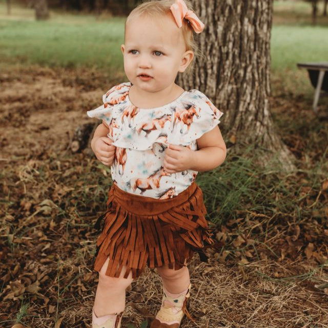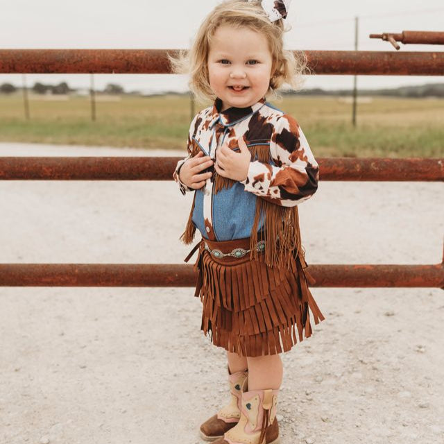 Brown Cowprint Fringe LS Pearl Snap Onesie, (0-18M)