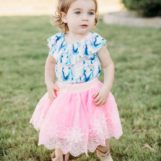 The Pink Lace Chiffon Skirt matches all our Shea Baby tops, and Shea Baby Boots.