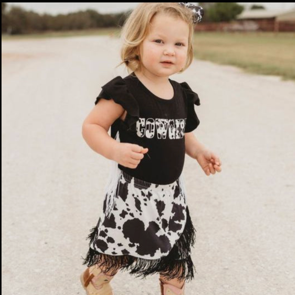 Every little girl loves Cowprint and Fringe! Style and Comfortable for even the tiniest cowgirls, these Cowprint Skirts are adorable! Keeping your kiddos cool and stylish, this skirt is a must for Spring and Summer!