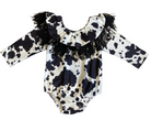 We love the Cowprint! This Long Sleeve off the Shoulder Cowprint shirt & onesie is one of our favorite prints. It is the perfect Fall outfit. This print will pair with multiple styles of Shea Baby Boots.