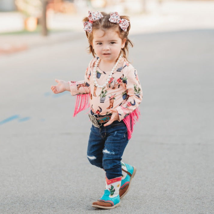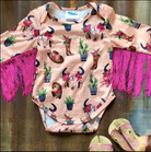 This shirt and onesie have a Way Out West Theme. With the perfect combination of Cactus, Steer Heads, Boots, AND 5 inch pink fringe, this print will sure make any little girl smile and shine!