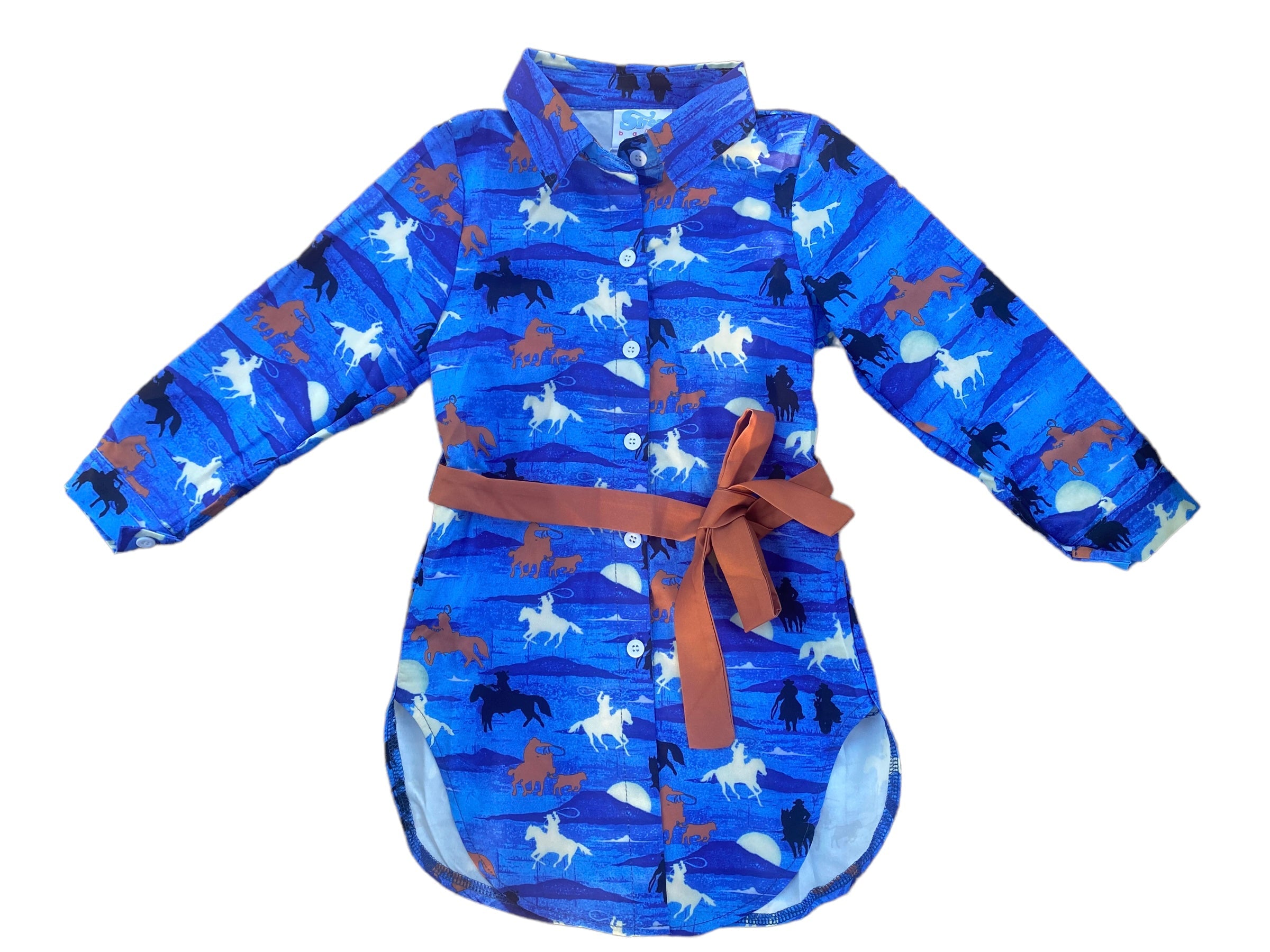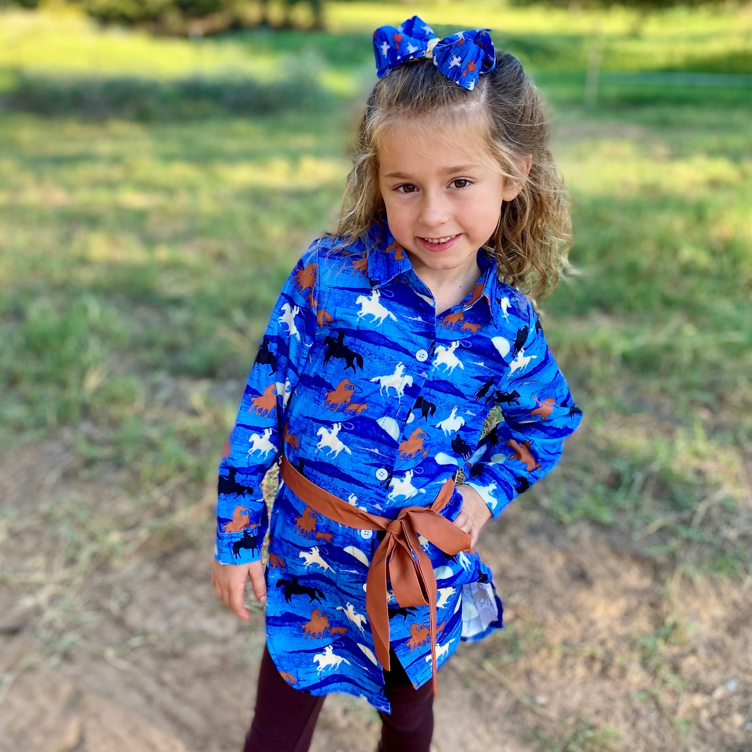 This adorable Blue running horse dress is perfect for your Fall & Winter days. Paired with some tights, a matching bow & some Shea Baby boots for the perfect cowgirl look.