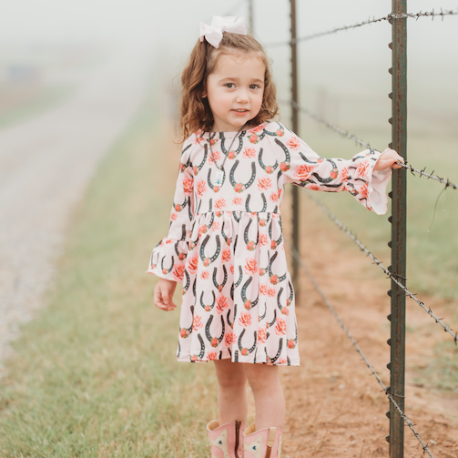 This beautiful Bell Long Sleeve Pink Dress with Roses and Horeshoe's is perfect for this Fall & Winter. Pair with a matching Bow & Shea Baby boots for the complete outfit.