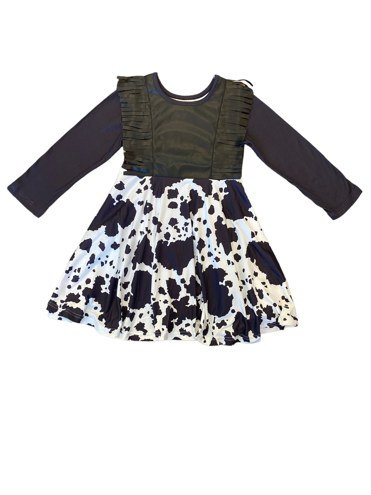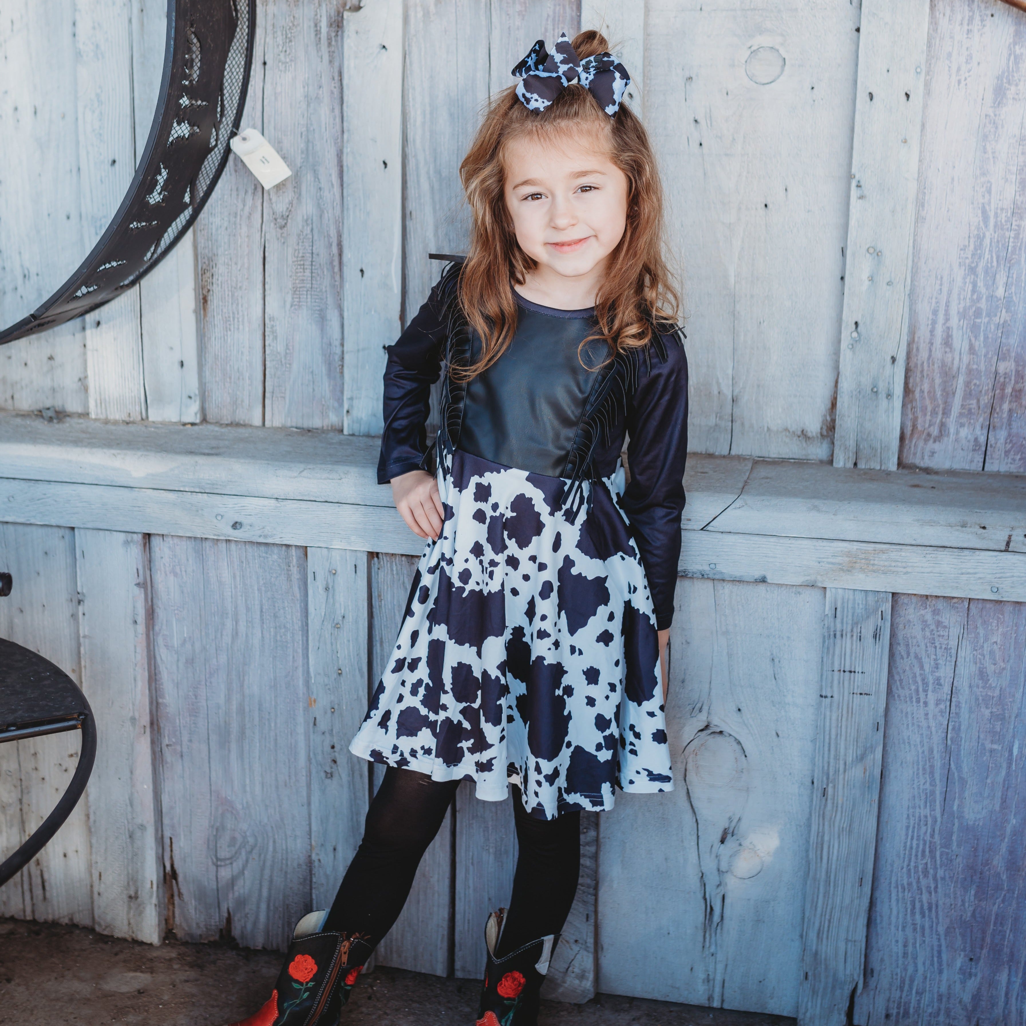 Cowprint Leather Fringe Dress will pair with multiple styles of Shea Baby Boots.