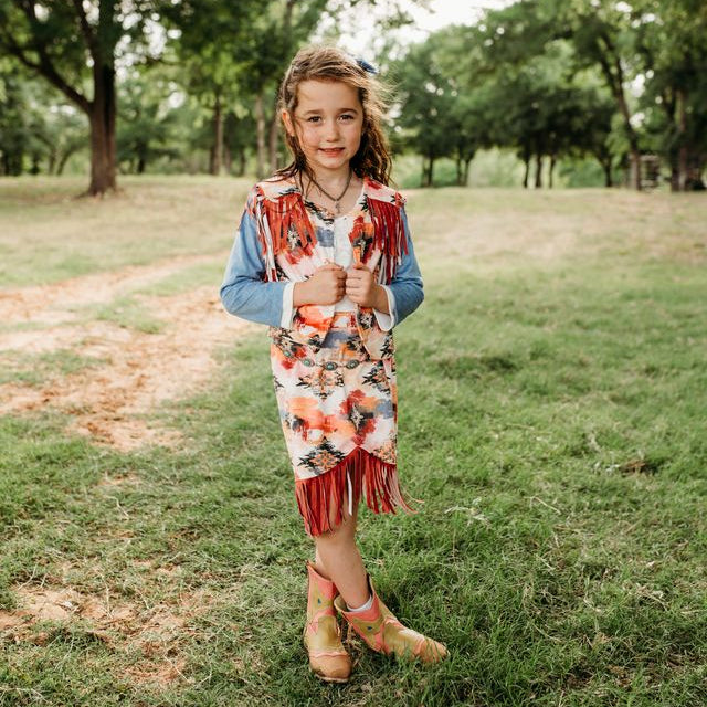 Let your cowgirl shine in our Aztec Denim & Fringe Set!! This stylish set has fun fringe details that is perfect for any little cowgirl stand out from the crowd! This set goes well with our Shea Baby Boots & Accessories!