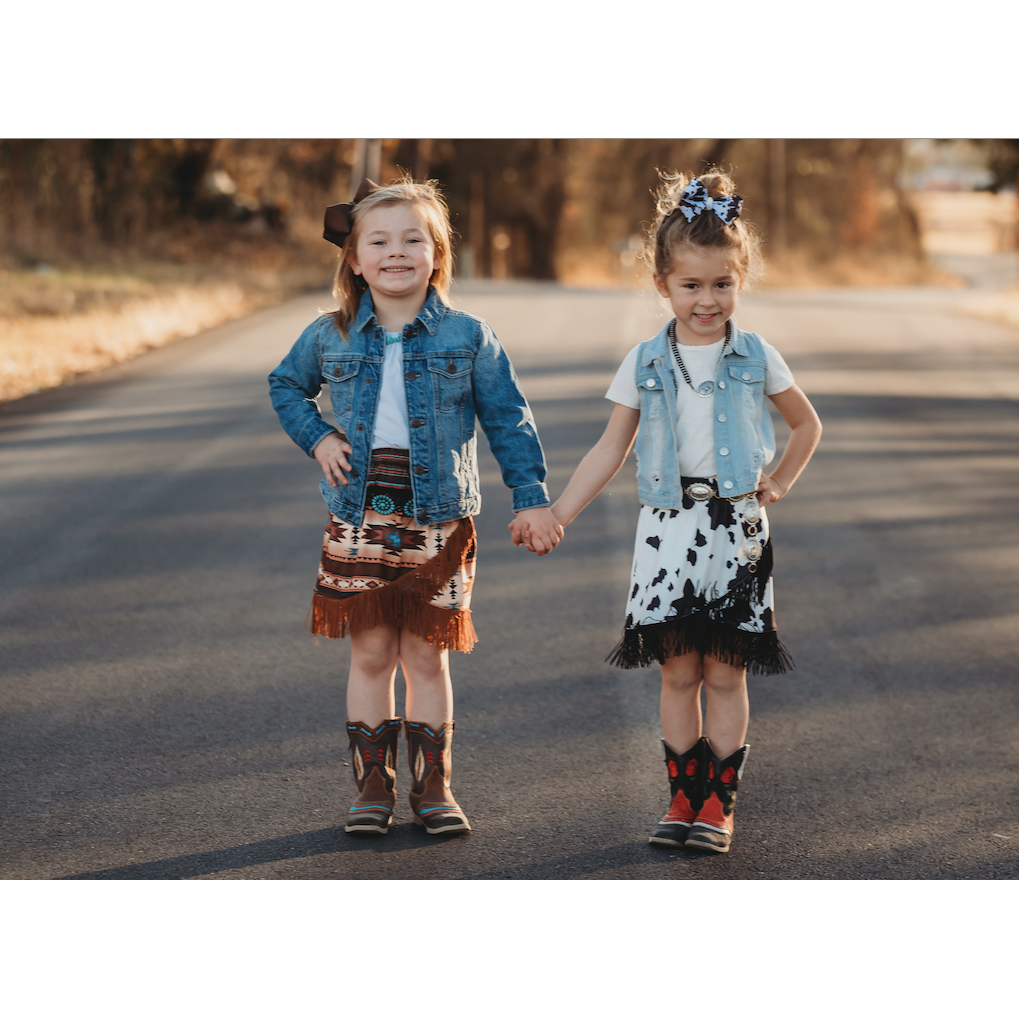 If your little ones are into being Unique, this is the skirt for you! Our Aztec Fringe Skirt is a staple in any closet. Paring this skirt with our Denim Fringe Jacket is a must!