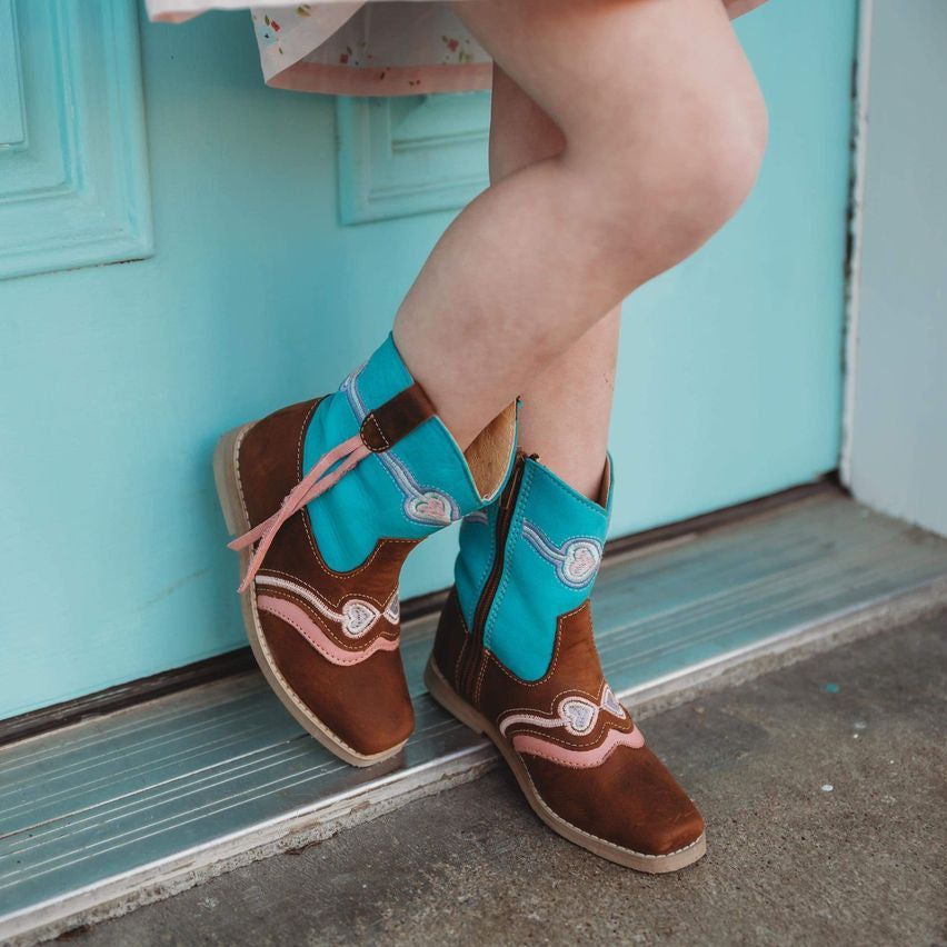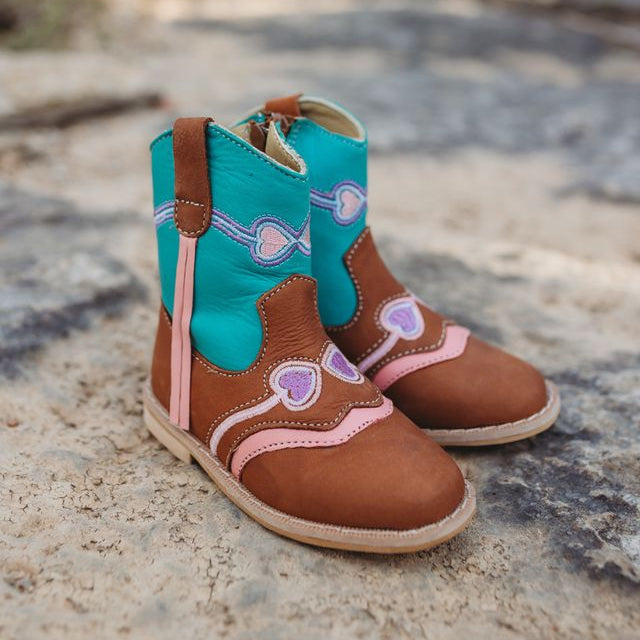 Our beautiful “Hadley” boots are adorned with the perfect pink and turquoise combo that will give any outfit a pop of color! The pink tassels and hearts will make every little girl smile! The turquoise and brown leather is soft and comfortable but made to last!