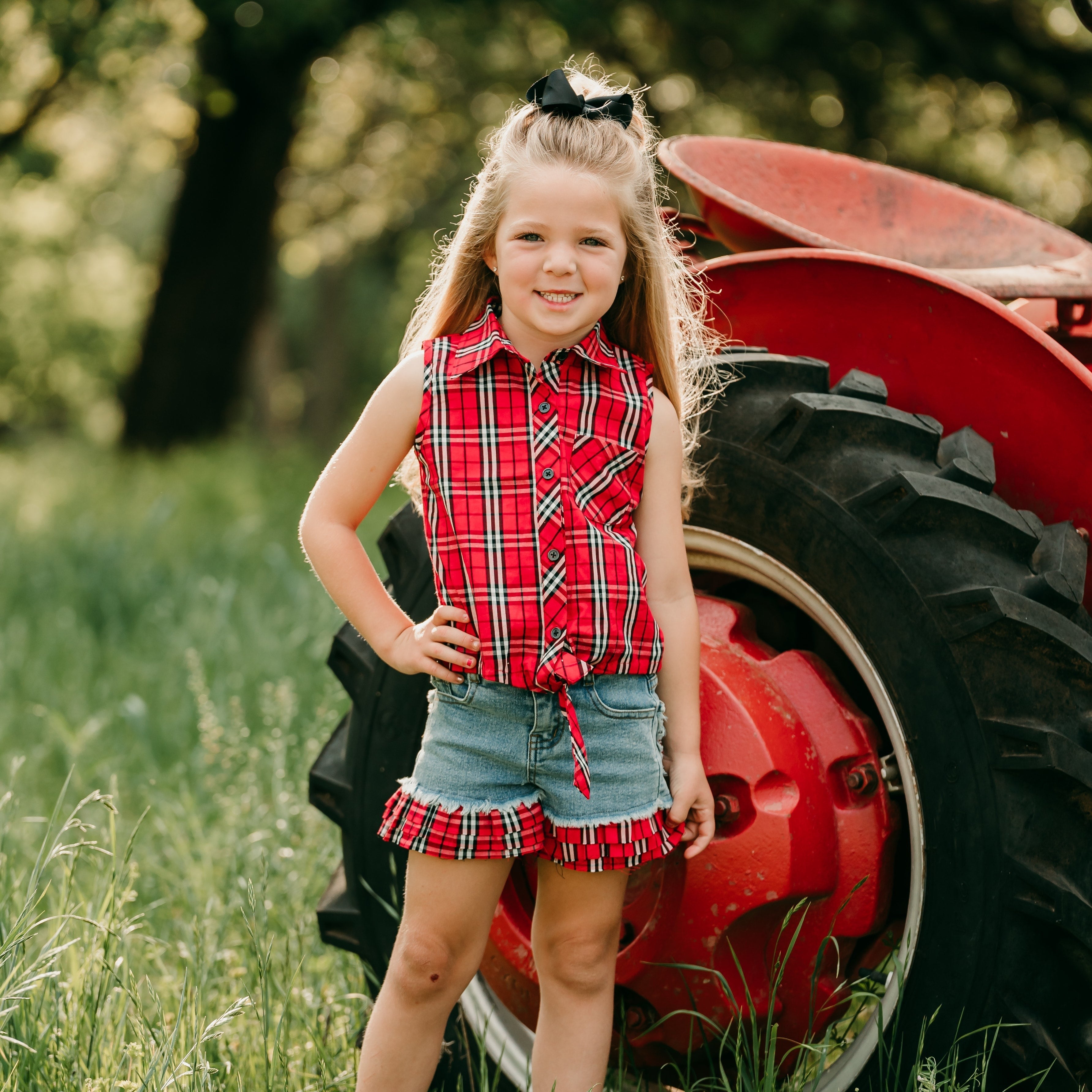 Shea Baby Red Plaid Tie shirts are comfortable and stylish! Be sure to complete the outfit with Shea Baby Denim Shorts with plaid ruffles!