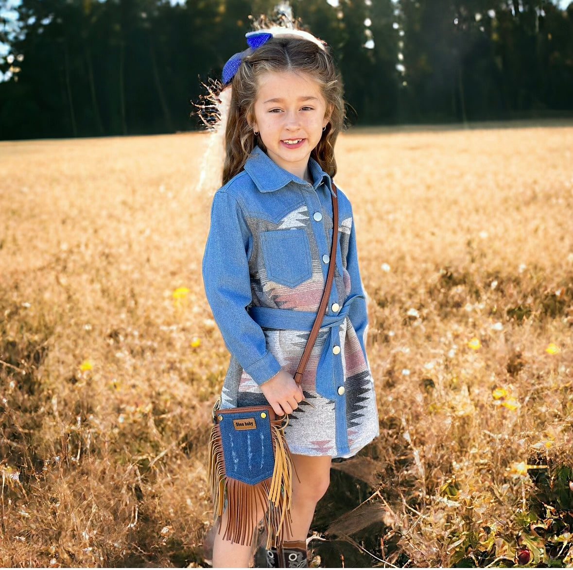 Saddle up, little cowgirls, because this denim leather fringe handbag is the perfect accessory for your wild adventures! Crafted with the finest denim and adorned with playful leather fringe, this bag exudes charm and style.