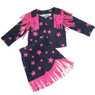 Your little girl will stand out from the crowd in the cute, stylish and fun Jacket and Skirt Suede Fringe Set! This is sold as a set! Pair with a Shea Baby top and boots for the perfect outfit!