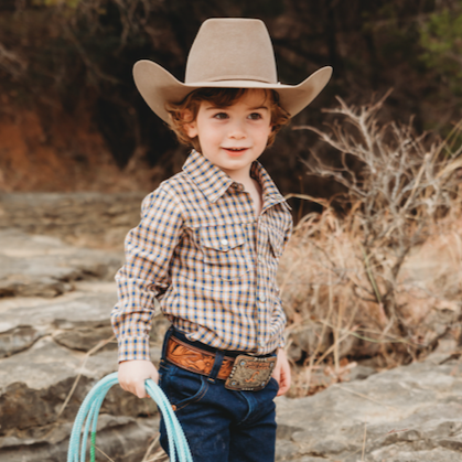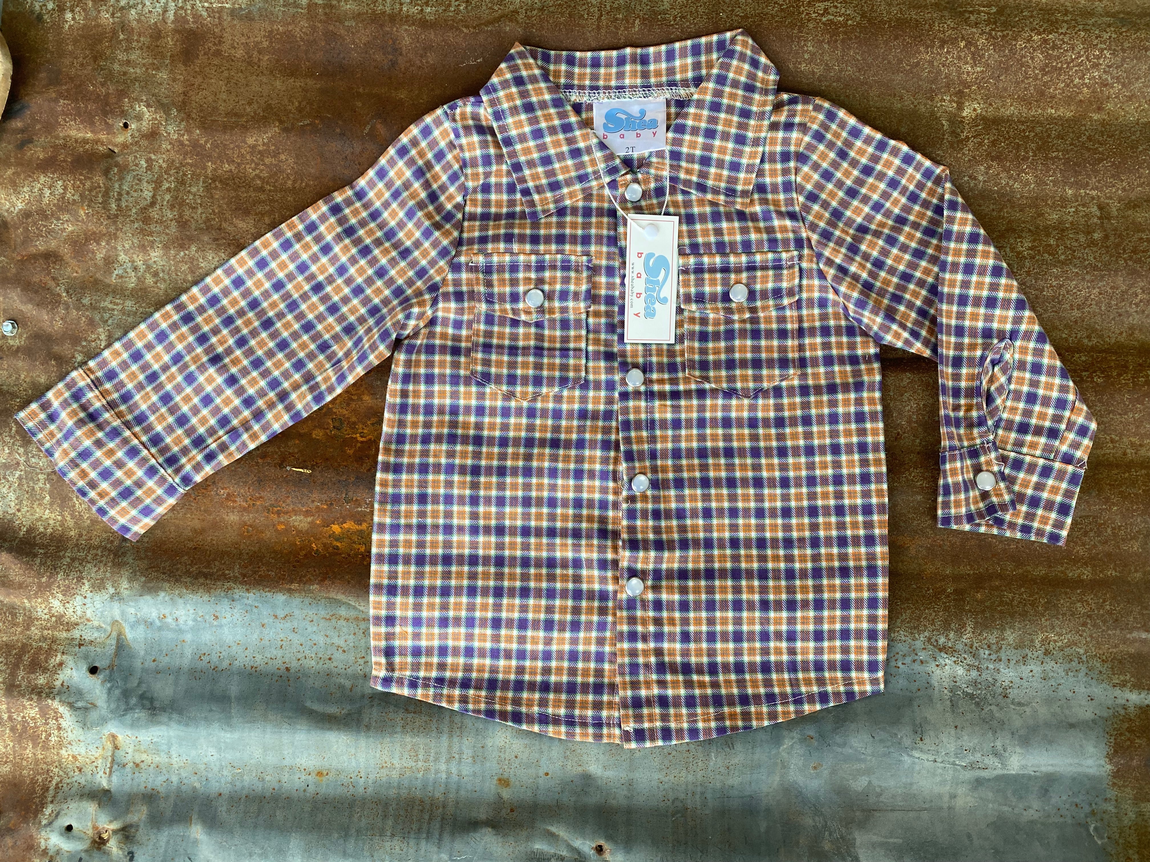 Crafted with stylish pearl snap buttons, this Plaid Long Sleeve Pearl Snap shirt will look handsome on your little one! The fun purple and orange colors and durable material make this shirt perfect for family parties and days on the ranch. Shea Baby Long Sleeve Snap shirts are a must for every cowboy!