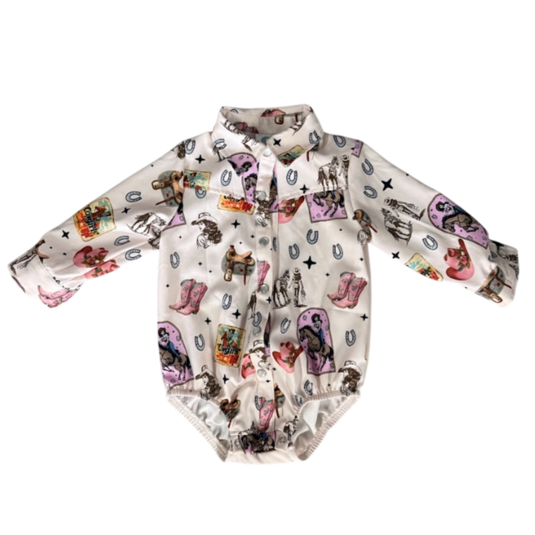 Crafted with stylish pearl snap buttons, this Pink Vintage Cowgirl LS Pearl Snap Shirt will look stylish on your little one! The durable material makes this shirt perfect for family parties and days on the ranch. Shea Baby Long Sleeve Snap shirts are a must for everyone!