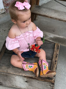 “Sophie” Sunflower boots make every cowgirl happy! These baby boots are made from real pink, brown, and yellow leather with beautiful sunflowers embroidered into them. “Sophie” can be dressed either up or down and can withstand any occasion!