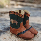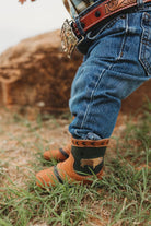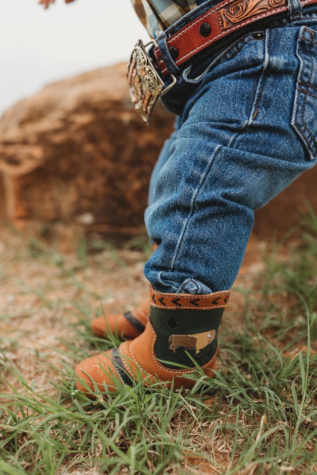 These embroidered buffalo boots are perfect for any little cowboy! The soft brown and blue leather matches any outfit and can be dressed up or down! “Tyen” soft leather is made to last and can outstand any day on the ranch!