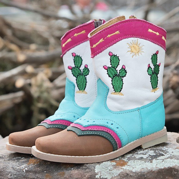 Outfit need a pop of color? Our “Pecos” Kids boot offers bright neon colors with beautiful, embroidered cacti. The color combination of pink, turquoise and green will bring a smile everywhere your little cowgirl goes! Made from real leather, these boots are made to last!