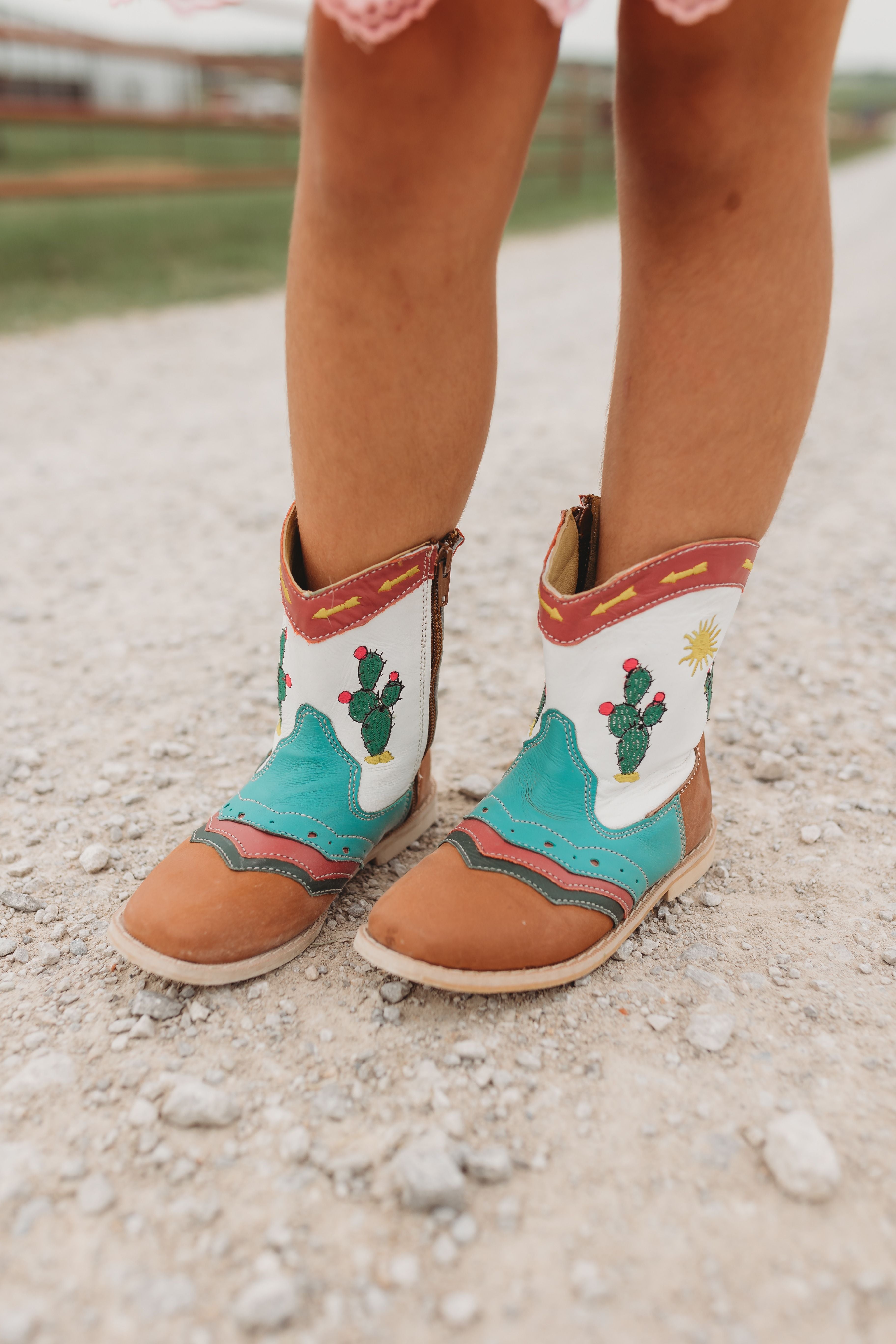 Outfit need a pop of color? Our “Pecos” toddler boot offers bright neon colors with beautiful, embroidered cacti. The color combination of pink, turquoise and green will bring a smile everywhere your little cowgirl goes! Made from real leather, these boots are made to last!