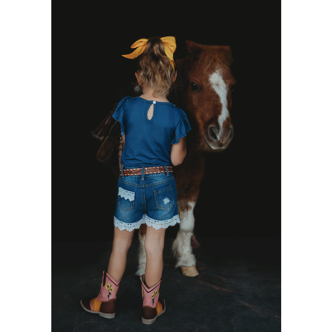 These Denim Lace shorts pair with all of our Shea Baby tops, and Shea Baby Boots.