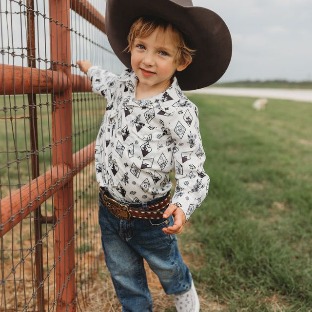 Crafted with stylish pearl snap buttons, this Long Sleeve Pearl Snap shirt will look handsome on your little one! The durable material makes this shirt perfect for family parties and days on the ranch. Shea Baby Short Sleeve Snap shirts are a must for every cowboy!