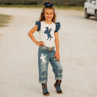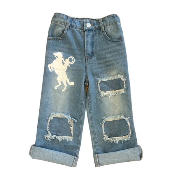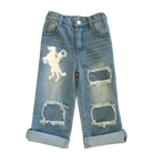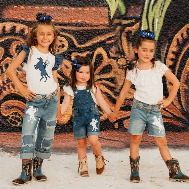 Give your little cowgirl the perfect blend of western flare and everyday comfort with our Raring Horse Denim Capris! Made with high quality denim, these capris feature a stylish mid-length cut, perfect for all seasons! These capris are designed for play, adventure and style!