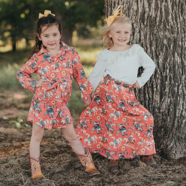 This adorable long sleeve button up fun western print dress is perfect for this Fall & Winter. Paired with a pair of tights & Shea Baby Boots for the complete outfit.