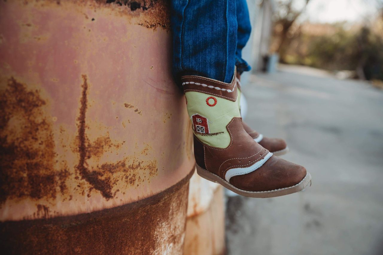 Our “Lawson” toddler boot offers a fun farm theme embroidered on the softest leather making it comfortable for farmers of all sizes. “Lawson” toddler boot displays a brown stitched tractor, red barn and even a cow! This boot is every little farmer’s dream!
