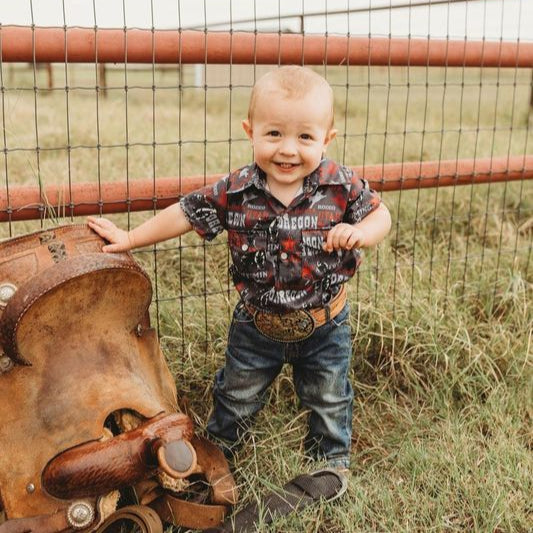 Crafted with stylish pearl snap buttons, this Short Sleeve Pearl Snap shirt will look handsome on your little one! The durable material makes this shirt perfect for family parties and days on the ranch. Shea Baby Short Sleeve Snap shirts are a must for every cowboy!
