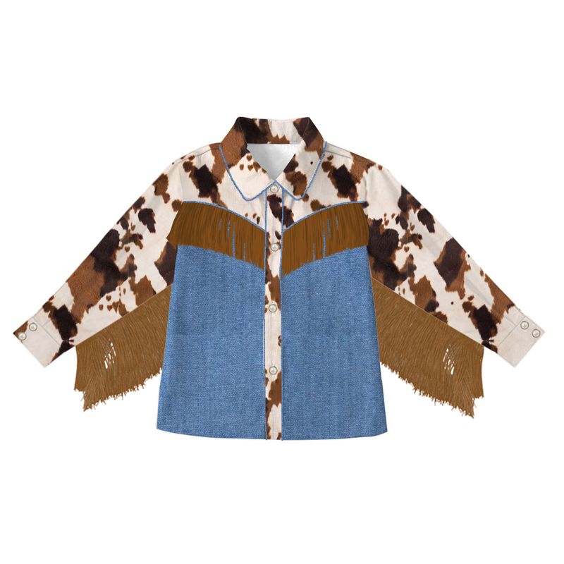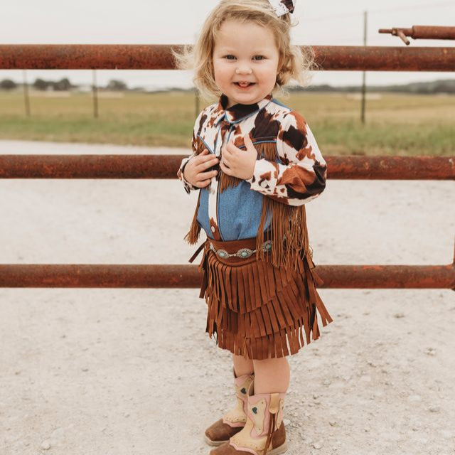 Brown Cowprint Fringe LS Pearl Snap Shirt, (2T-5T)