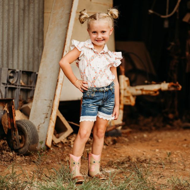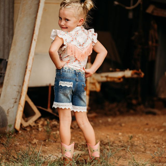 These Denim Lace shorts pair with all of our Shea Baby tops, and Shea Baby Boots.