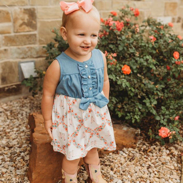 Classic western style meets everyday comfort with our Floral Boot Denim Dress! This dress is the perfect combination of style & comfort that your little girl will love!