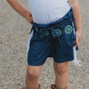 Demin and Soft? Style and Comfortable for even the tiniest cowgirls, these Denim print shorts are adorable with a pop of fringe for fun! Keeping your cowgirls cool and stylish, these shorts are a must for Spring and Summer!