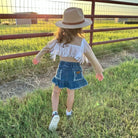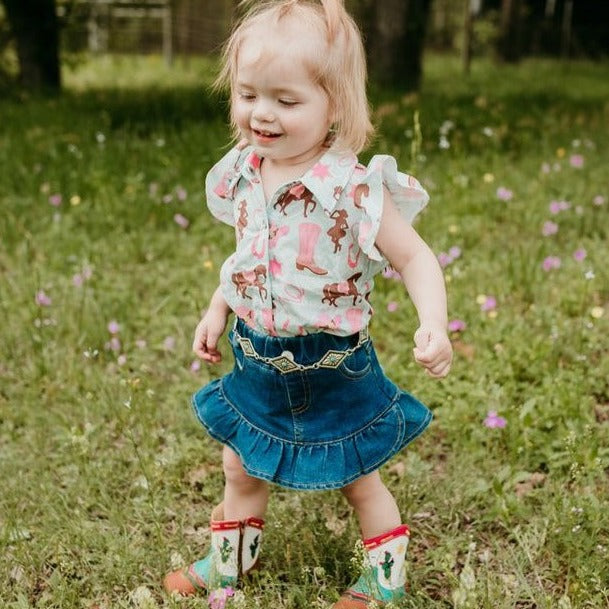 The Denim Skirt matches all of our Shea Baby tops, and Shea Baby Boots.