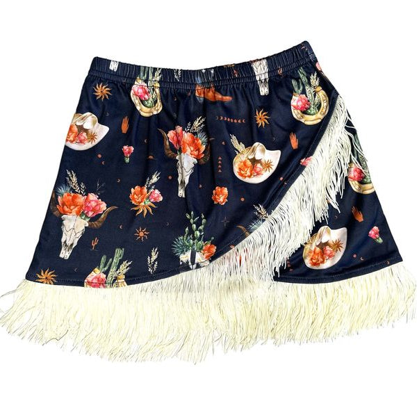 This Black Floral Skull Fringe Skirt is complimented by any of our Shea Baby Boots and Tops.