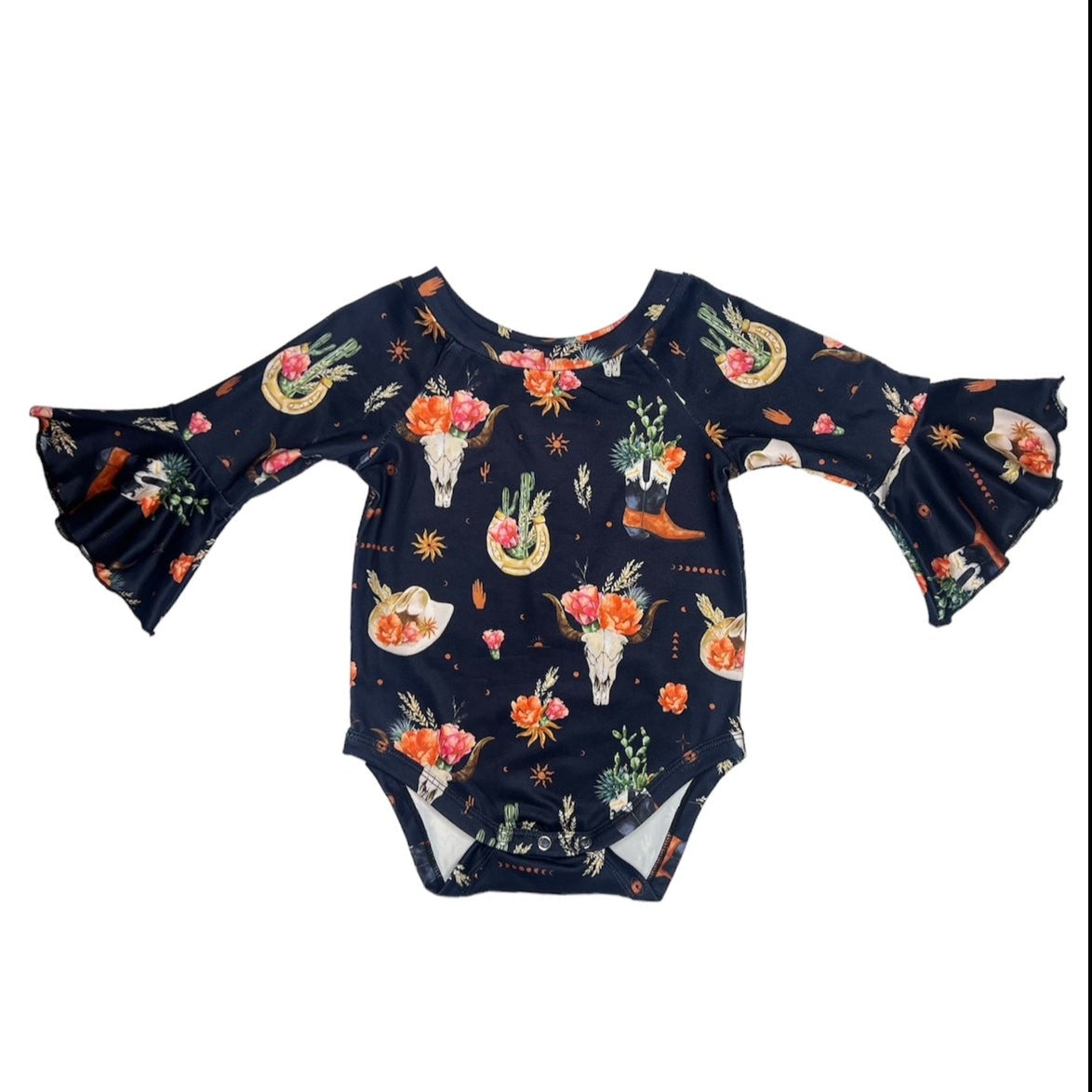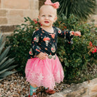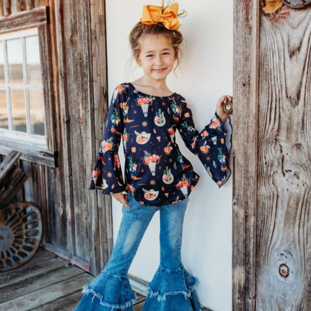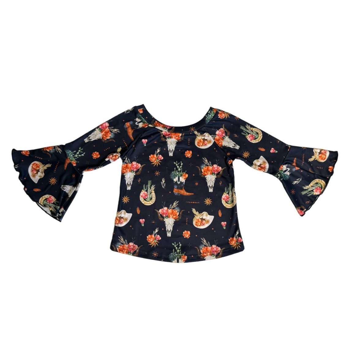 Black Floral Skull Bell Long Sleeve Top (2T-5T)
