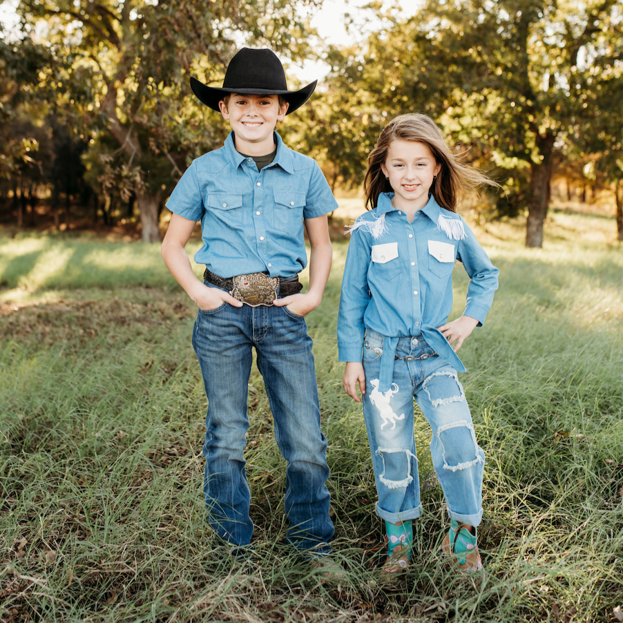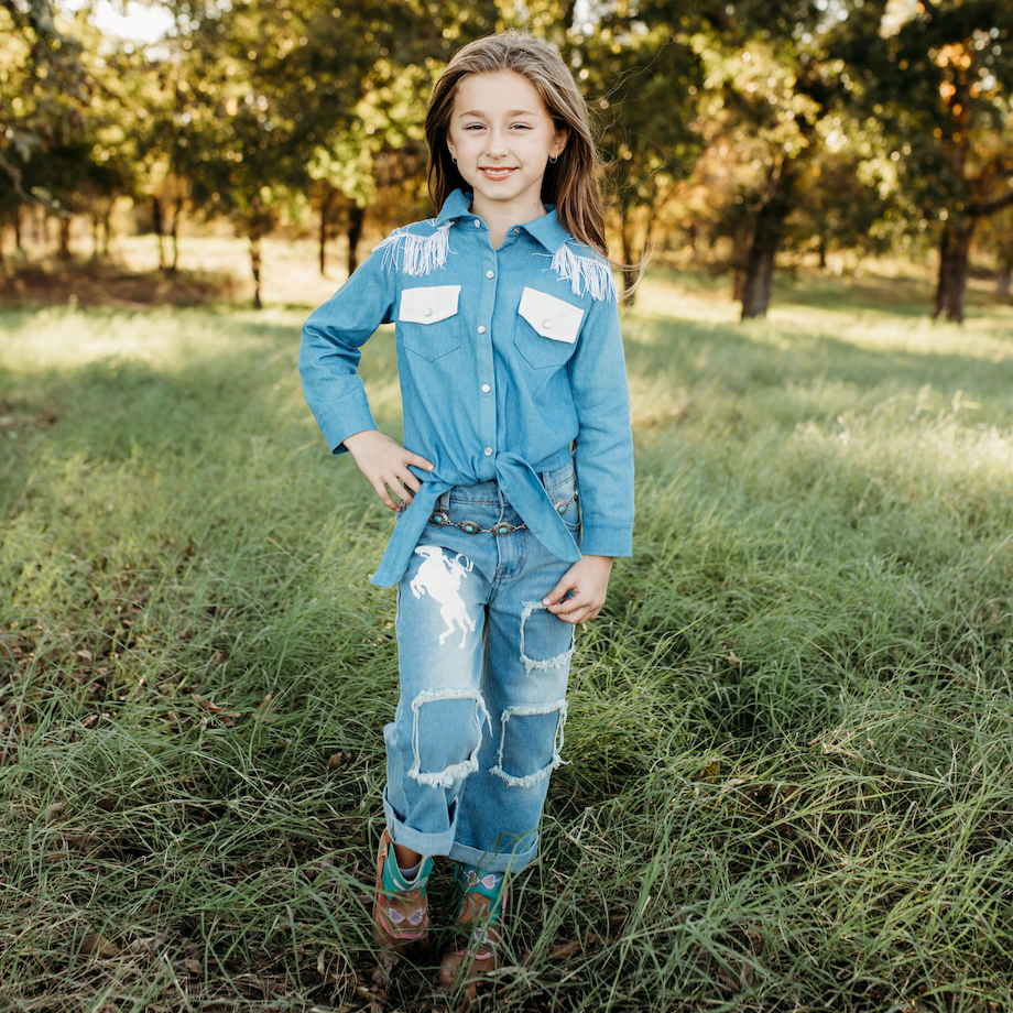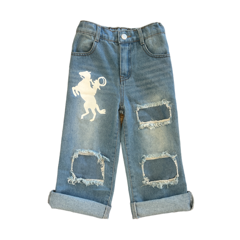 These stylish denim capris feature a bold rearing horse design, perfect for cowgirls who love to stand out! Made from durable, comfortable denim with just the right amout of stretch, they are ideal for everyday wear!
