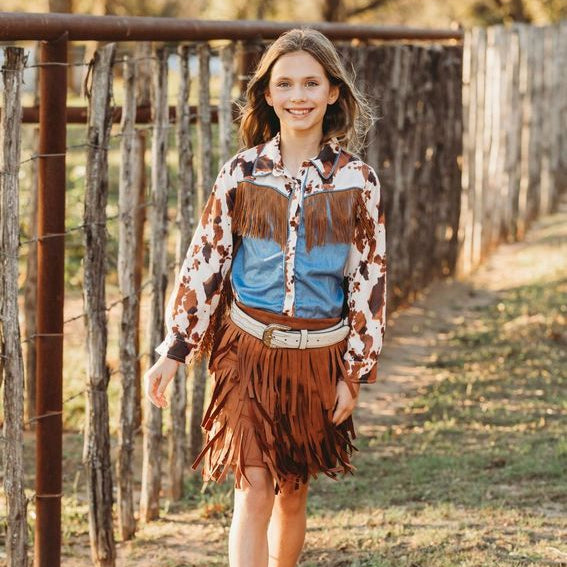 Brown Cowprint Fringe LS Pearl Snap Shirt Youth (8-14)