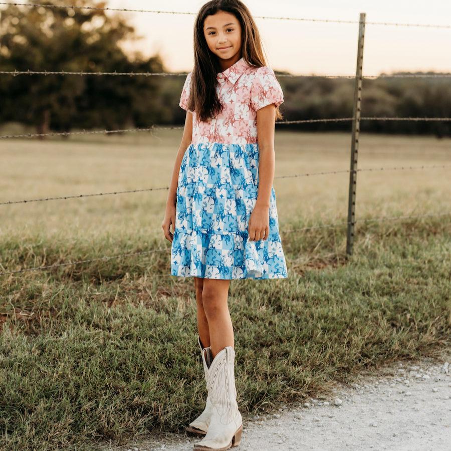Perfect for cowgirls, this plaid bucking horse flow dress blends classic western style with playful fun! This soft, breathable fabric makes this dress a must have this Spring/ Summer!