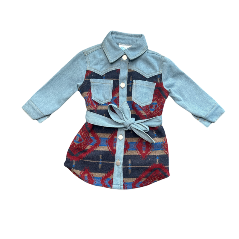 Our Aztec Denim Dress is the perfect blend of western charm & winter style. Crafted from high quality material this dress keeps your little cowgirl cozy in style! This is a must have this season!