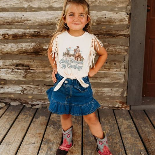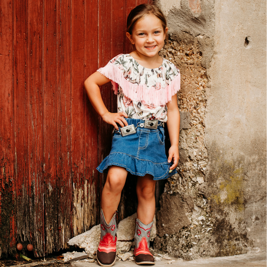 The Denim Skirt matches all of our Shea Baby tops, and Shea Baby Boots.