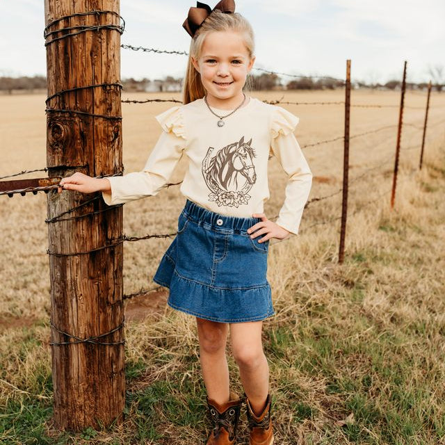 The Denim Skirt matches all of our Shea Baby tops, and Shea Baby Boots.